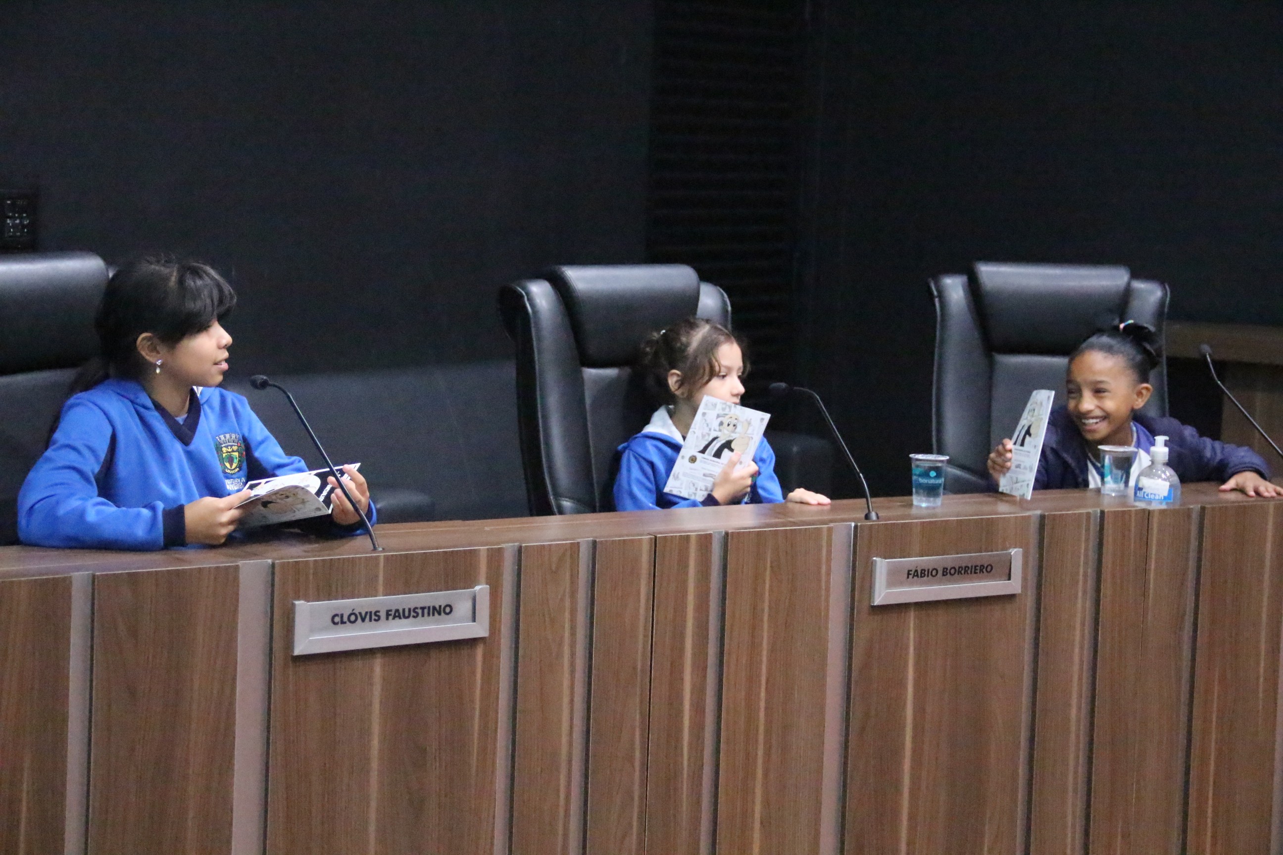 No auditório, assistem a um vídeo especialmente preparado com linguagem adequada ao público infantil. Receberam informações sobre o trabalho do vereador, o funcionamento de uma Câmara Municipal e as diferenças entre os três poderes. Os vereadores Julio Cezar e Clayton Finamore receberam e conversaram com os alunos em seus gabinetes.