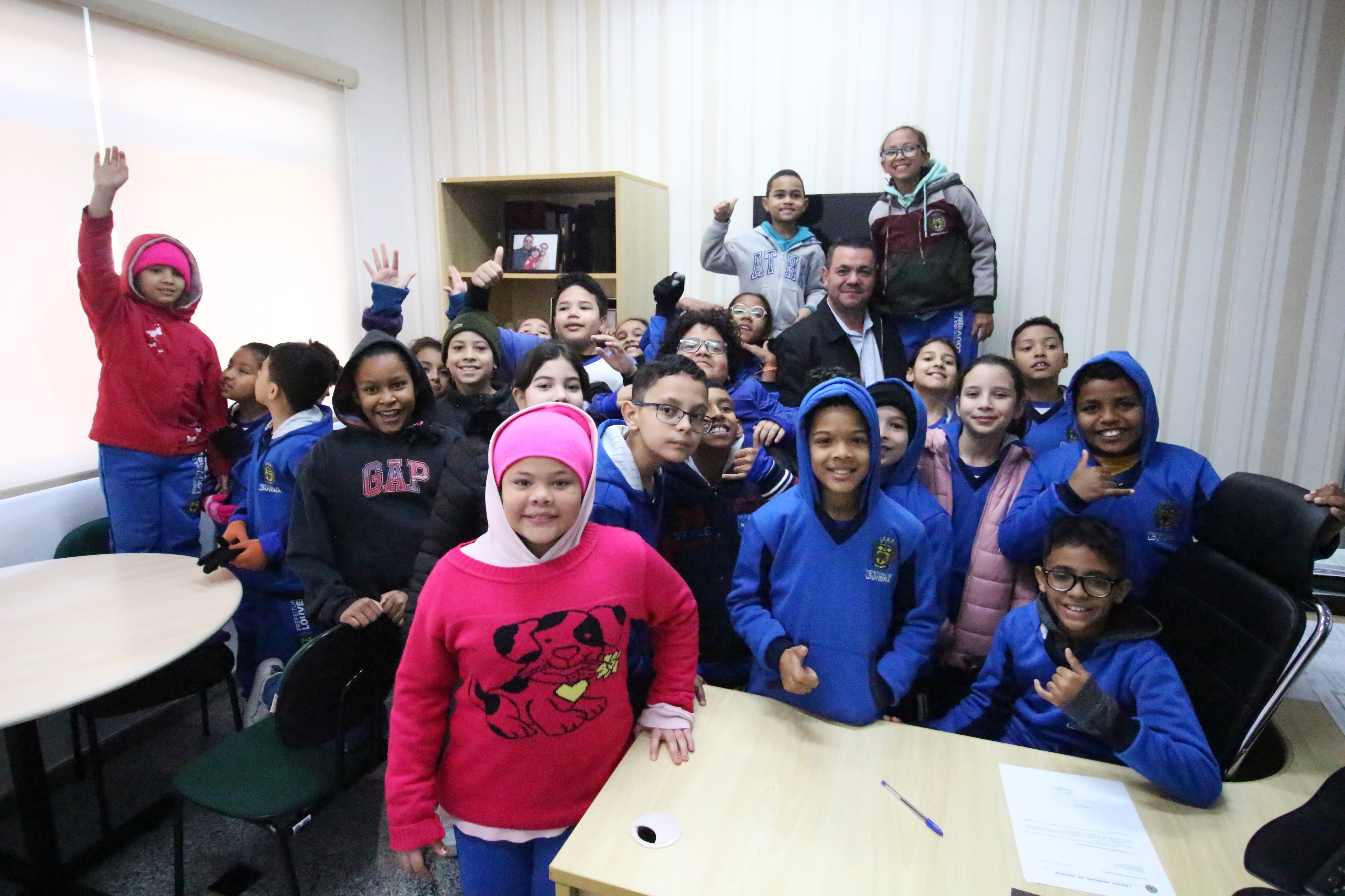 Após serem recepcionados, os alunos da Frederico Pagotto foram conhecer a sala da presidência, as salas administrativas, o estúdio de TV e os gabinetes dos demais vereadores. No dia de hoje, o vereador Clayton conversou com as crianças.